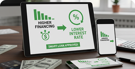 نوفّر لك حلول تمويل بقيم أعلى وبنِسَب أقل، مع خطط سداد مرنة تناسب احتياجاتك وقدرتك المالية. نساعدك في الحصول على أفضل العروض التمويلية التي تضمن لك تقليل الأعباء الشهرية وتحقيق استقرار مالي أكبر